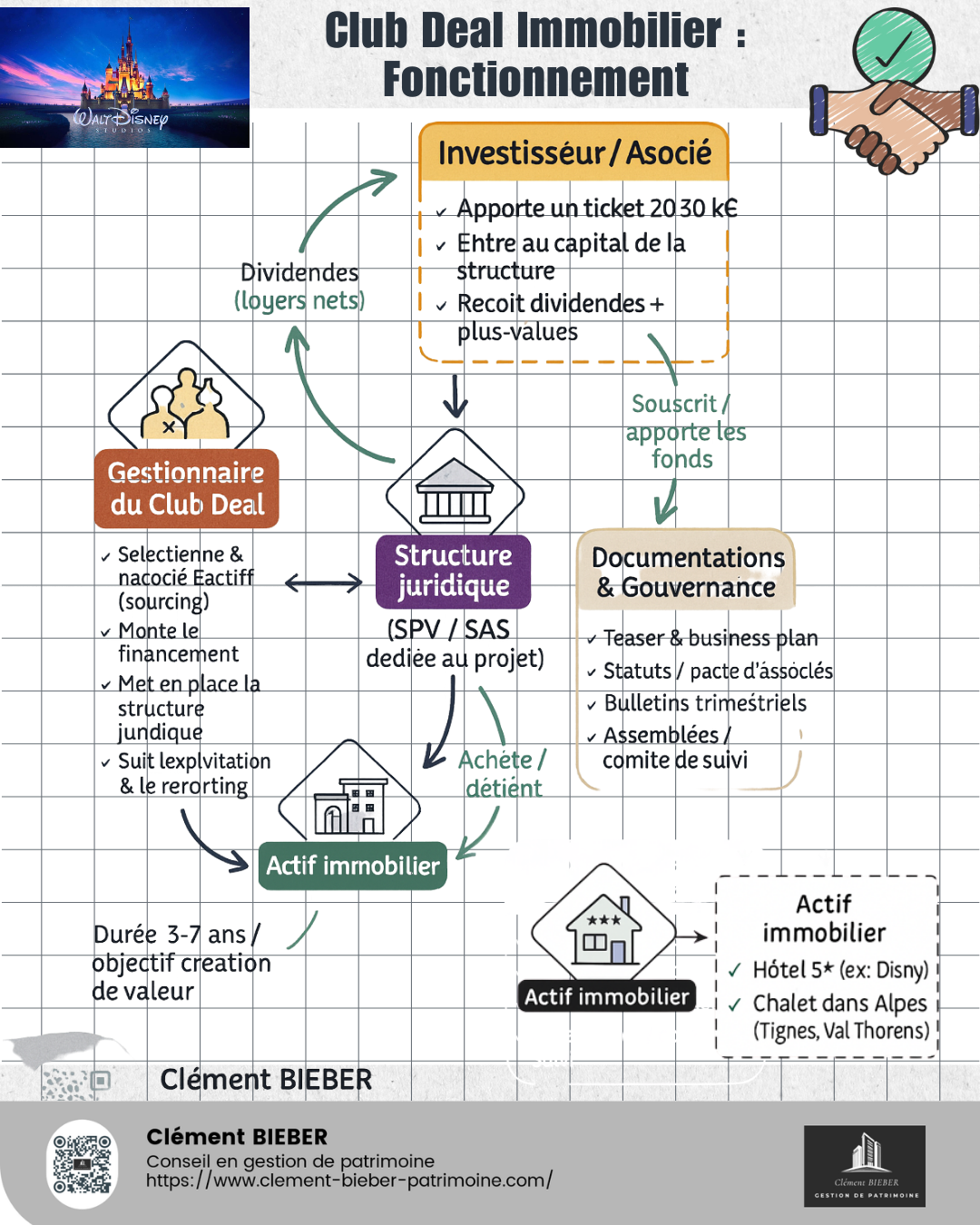 ✅ Accessibilité : ticket d’entrée à partir de 20–30 K€, bien plus bas que l’achat en direct. ✅ Immobilier d’exception : hôtels 5⭐, chalets haut de gamme, résidences uniques. ✅ Alignement d’intérêts : le gestionnaire investit avec vous (co-investissement). ✅ Structuration sécurisée : société dédiée (SPV/SAS/SCI) + documentation claire (business plan, statuts, pacte d’associés). ✅ Gestion professionnelle : sourcing, financement, exploitation, reporting.