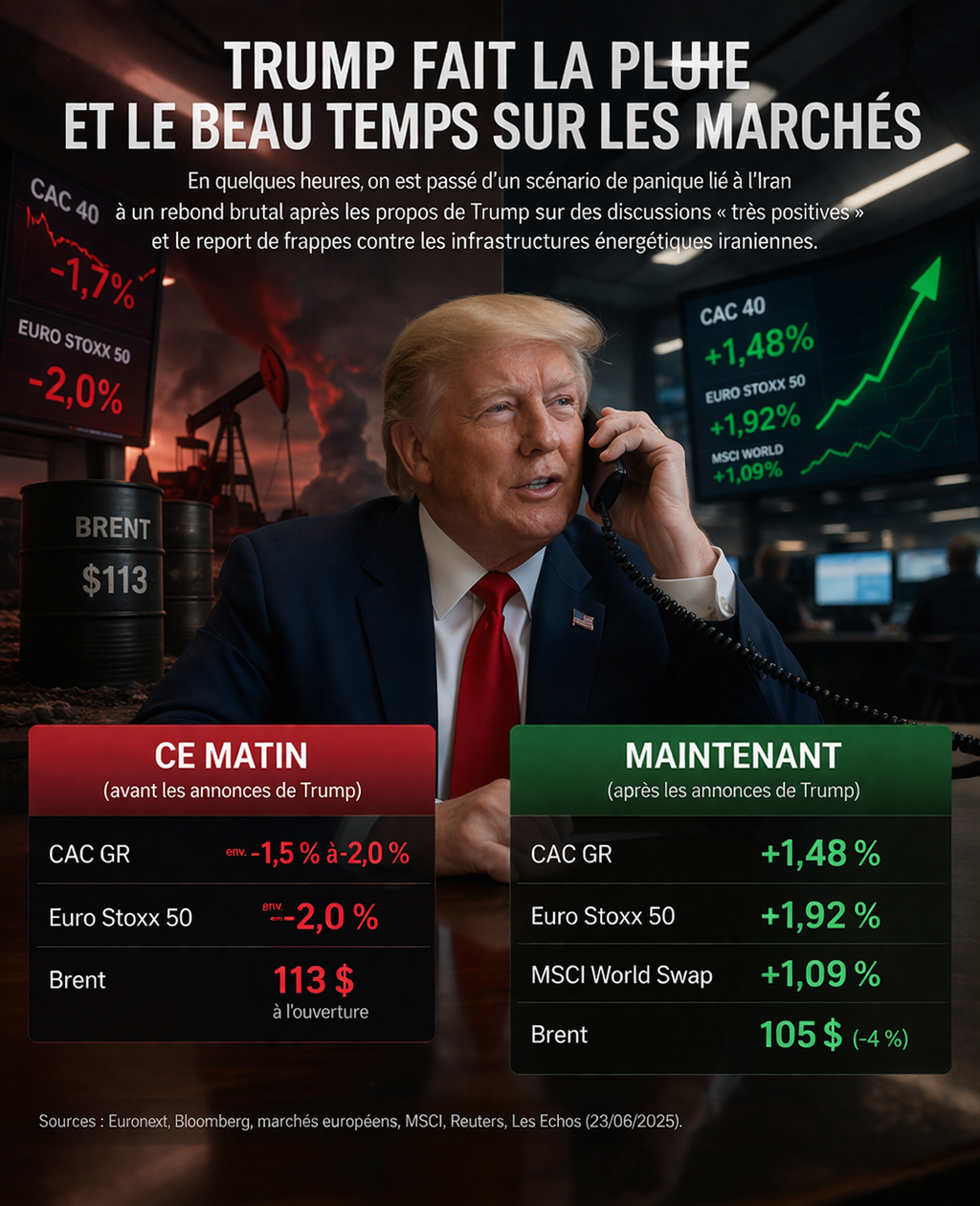 Puis le ton a changé. Après les déclarations de Trump sur des échanges jugés très positifs avec l’Iran, le marché a immédiatement revu son scénario central. Le pétrole a reflué, les craintes d’un choc énergétique se sont apaisées, et les actifs risqués ont rebondi. Au moment de ton arrêt sur image, le CAC GR progressait de 1,48 %, l’Euro Stoxx 50 de 1,92 %, le MSCI World Swap de 1,09 %, tandis que le Brent revenait vers 105 dollars, soit environ 4 % de moins que son niveau d’ouverture retenu dans le visuel. Le sens du mouvement est confirmé par les dépêches de marché publiées après les annonces.