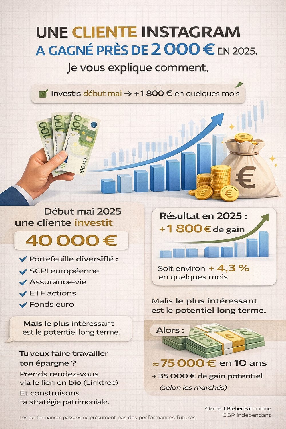 Découvrez comment une cliente a généré près de 2 000 € de gains en quelques mois grâce à une stratégie d’investissement diversifiée combinant SCPI, assurance-vie et ETF. Un exemple concret de gestion de patrimoine.